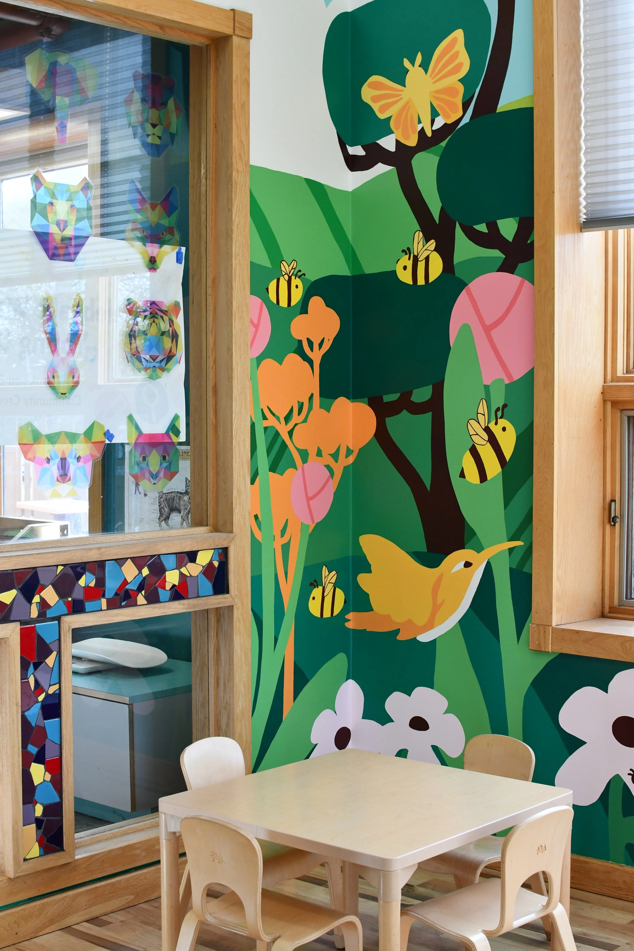 This mural was painted in the Family Learning Area located at the Ithaca Sciencenter. The room measures 275.5 sq. ft. My inspiration for this project was the live bee exhibit that I enjoyed as a child, and my love for the local scenery and nature in Ithaca. It features a landscape of fields, pollinators, pollinator plants, a rainbow, an expansive sky, and much more.